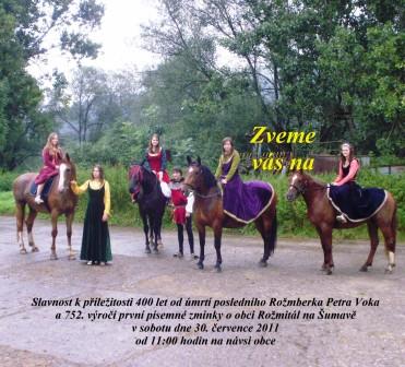20.07.2011 00:45V sobotu 30. července 2011 od 11:00 hodin pořádá obec Rožmitál na Šumavě již tradiční letní slavnost, věnovanou tentokrát vzpomínce na posledního Rožmberka Petra Voka, od jehož úmrtí uplyne letos 400 let, a 752. výročí první písemné zmínky o Rožmitálu (v r. 1259 pan Vok - nikoli Petr, leč jeho prapra...předek - z Rožmberka věnoval podací právo k farnímu kostelu v nové tržní osadě Rosenthalu právě založenému cisterciáckému klášteru ve Vyšším Brodu). Oslav se zúčastní i jízdní družina z naší ekofarmy, oděná do historických rób.