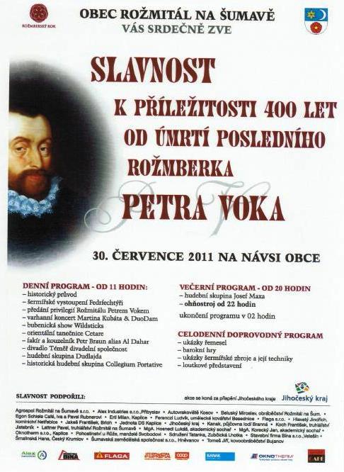 20.07.2011 00:45V sobotu 30. července 2011 od 11:00 hodin pořádá obec Rožmitál na Šumavě již tradiční letní slavnost, věnovanou tentokrát vzpomínce na posledního Rožmberka Petra Voka, od jehož úmrtí uplyne letos 400 let, a 752. výročí první písemné zmínky o Rožmitálu (v r. 1259 pan Vok - nikoli Petr, leč jeho prapra...předek - z Rožmberka věnoval podací právo k farnímu kostelu v nové tržní osadě Rosenthalu právě založenému cisterciáckému klášteru ve Vyšším Brodu). Oslav se zúčastní i jízdní družina z naší ekofarmy, oděná do historických rób.