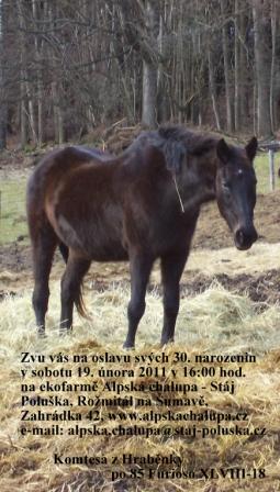 12.02.2011 10:42V sobotu 19. února se dožívá třiceti let naše klisna Komtesa, český teplokrevník z Hraběnky, po 85 Furioso XLVIII-18, v současné době náš nejstarší kůň. Chcete-li jí osobně popřát, přijďte ji navštívit v tento den v 16:00 hodin, kdy pro ni pořádáme oslavu.